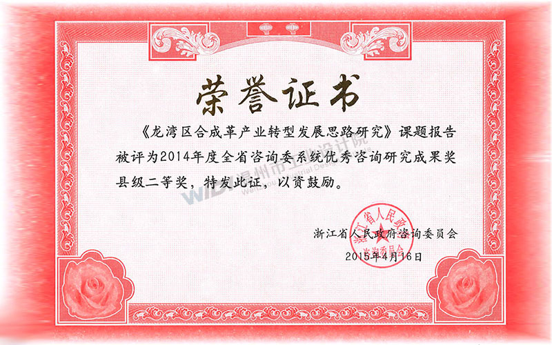 龍灣區(qū)合成革產業(yè)轉型發(fā)展思路研究 省咨詢委系統(tǒng)優(yōu)秀咨詢研究成果獎縣級二等獎
