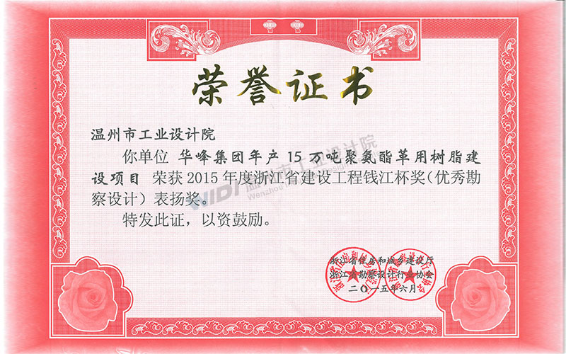 華峰集團年產15萬噸聚氨酯革用樹脂建設項目建設工程 錢江杯表揚獎