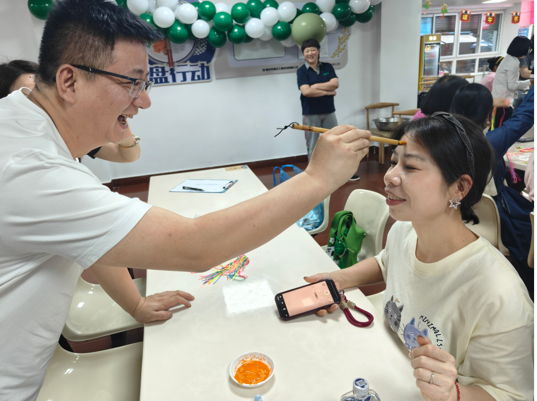 除了包粽子外,還組織了縫香包、編蛋袋、撞蛋、點額等形式多樣的活動。其中點額儀式則是端午節(jié)活動中的一項重要儀式?,F(xiàn)場擺放著雄黃酒和艾草制品,大家將雄黃酒點在額頭、耳后、手腕等處,雄黃酒香氣四溢、艾草清香撲鼻,構(gòu)成了端午獨特的氣息,這不僅是對傳統(tǒng)文化的尊重與傳承,更是讓我們在現(xiàn)代生活中仍感受到那份來自古代的智慧與關懷。